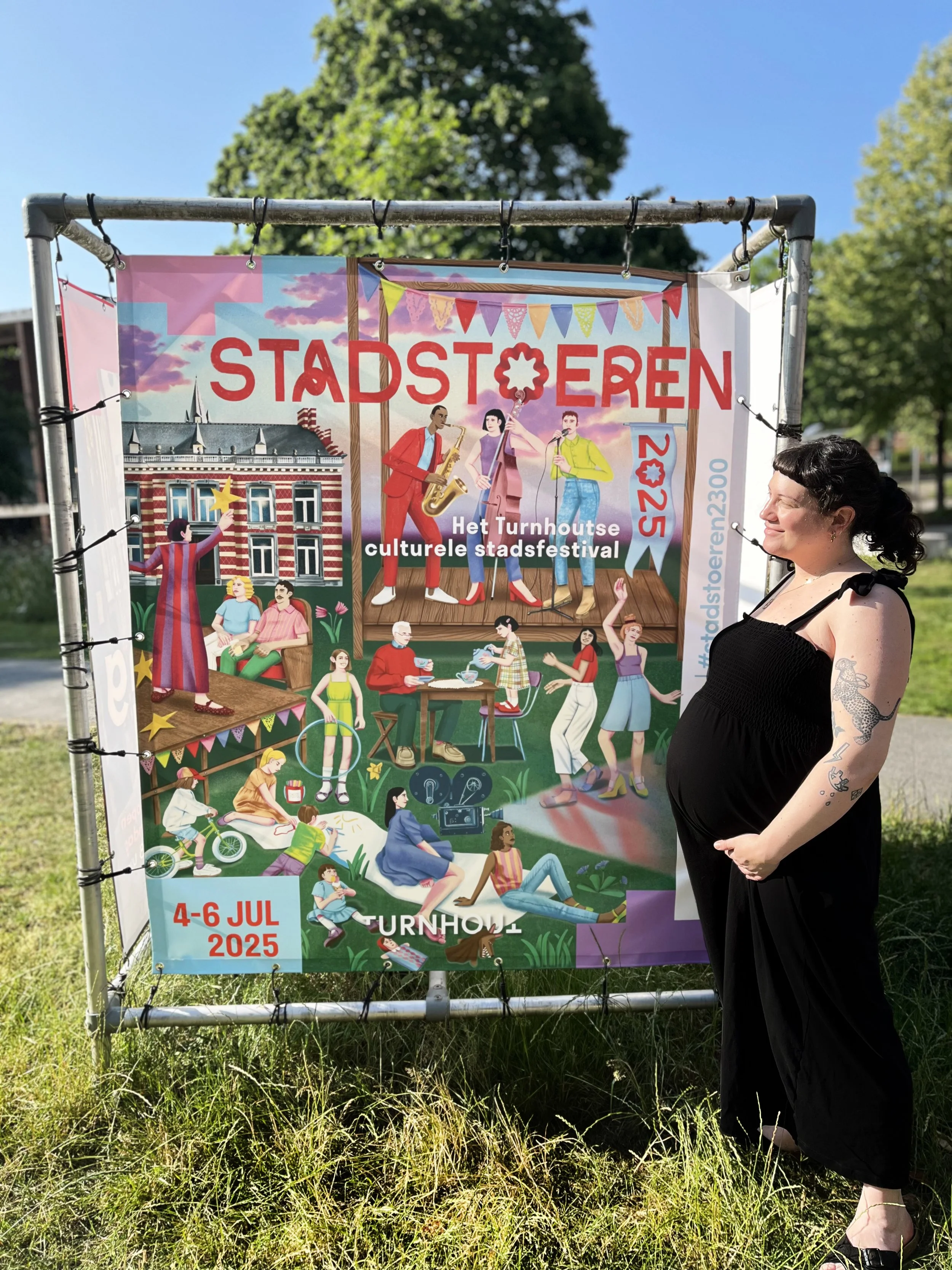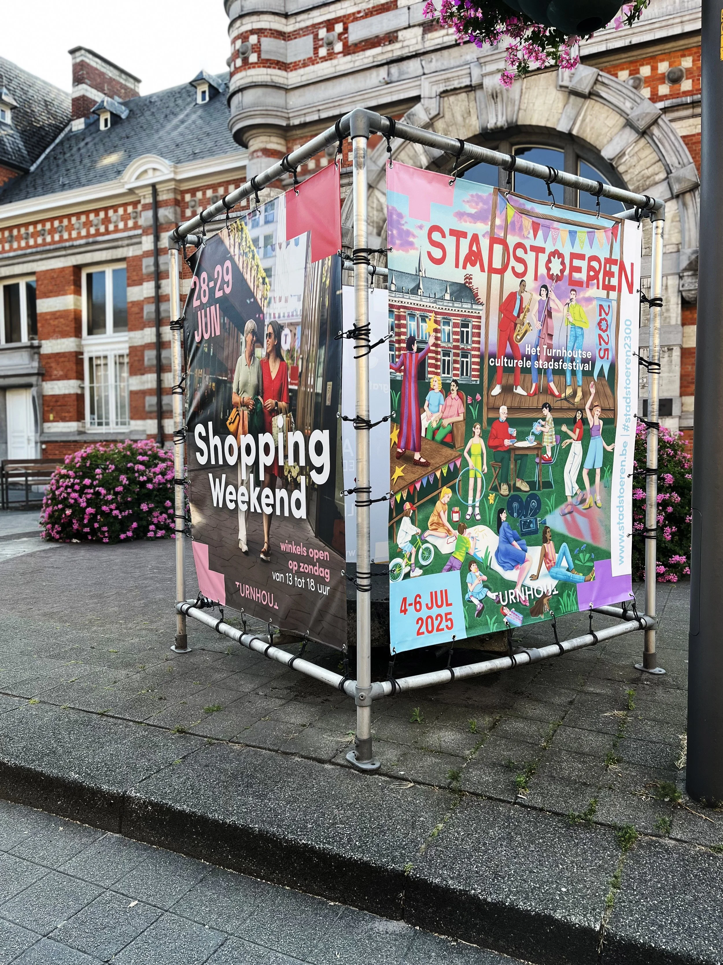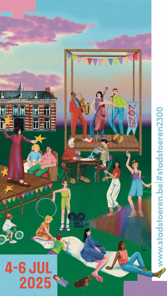 Poster illustration for Turnhout’s biennial festival Stadstoeren, which invites residents to rediscover their city through art, music and community events. Inspired by the festival’s spirit of exploration, the design features playful, map-like elements that celebrate movement and connection. The artwork was adapted across formats, from city posters and web banners to a screen print edition, a colouring page for kids and an animated loop by Stad Turnhout’s communications team.